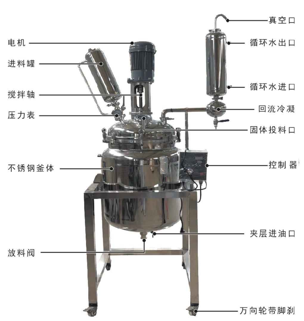 雙層不銹鋼反應釜為雙層不銹鋼設計,內層放入反應溶媒可做攪拌反應,夾層通上不同的冷熱源(冷凍液,熱水或熱油)做循環加熱或冷卻反應。在設定恒溫條件下